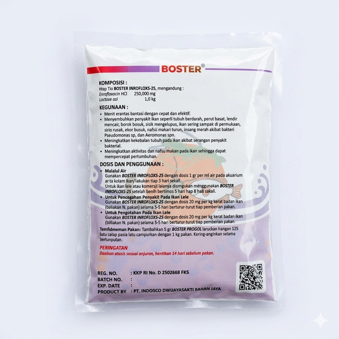 Booster Inrofloxs merupakan salah satu produk antibiotik ikan dengan kandungan enrofloxacin sebanyak 25%. Produk ini berbentuk bubuk yang dikenal sebagai pembasmi bakteri paling ampuh juga efektif pada ikan dan udang.