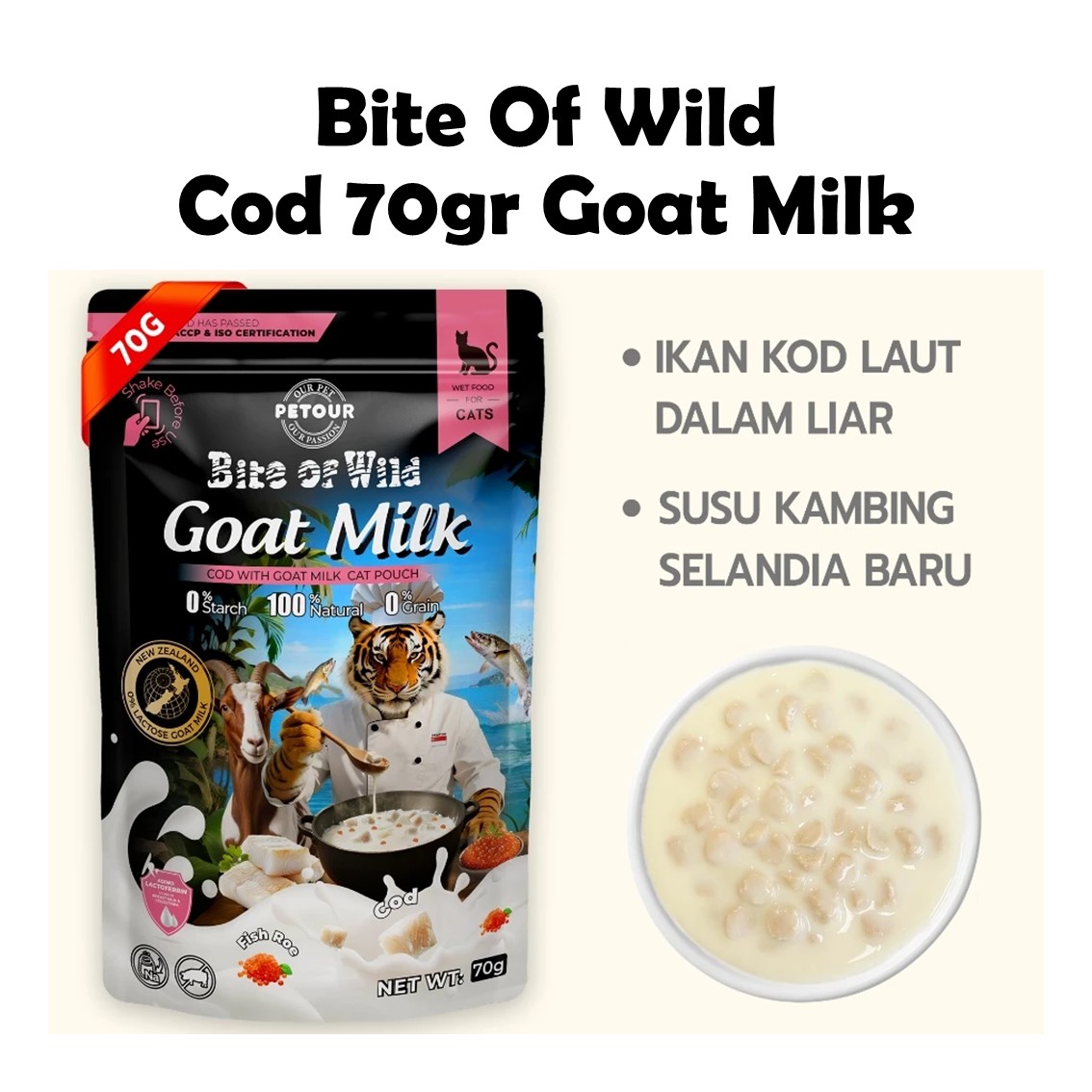 Bite of Wild varian Ikan Cod Liar ini adalah perpaduan sempurna antara 30% Ikan Cod Liar, 20% Ikan Tuna, dan 10% Susu Kambing Bebas Laktosa. Ditambah dengan 3% Telur Ikan, snack fungsional ini memberikan ledakan nutrisi laut yang tak tertandingi untuk anabul Anda.