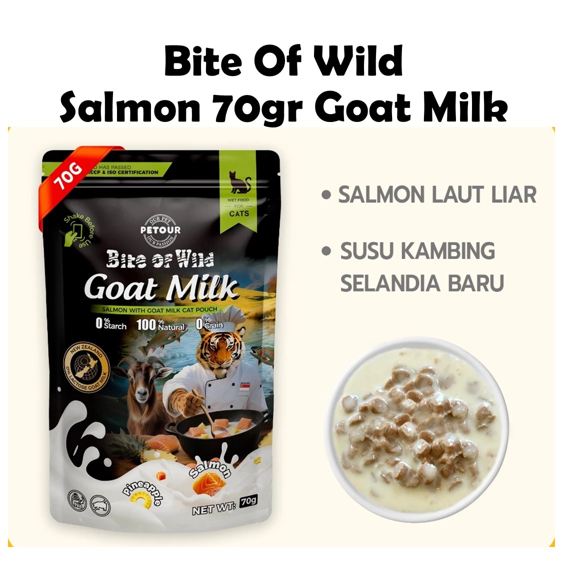 Bite of Wild varian Salmon ini mengombinasikan kebaikan Salmon Premium dengan 10% Susu Kambing Bebas Laktosa. Diformulasikan khusus untuk kucing yang membutuhkan perawatan ekstra pada kulit dan persendian, serta kucing yang memiliki pencernaan sensitif terhadap protein unggas.