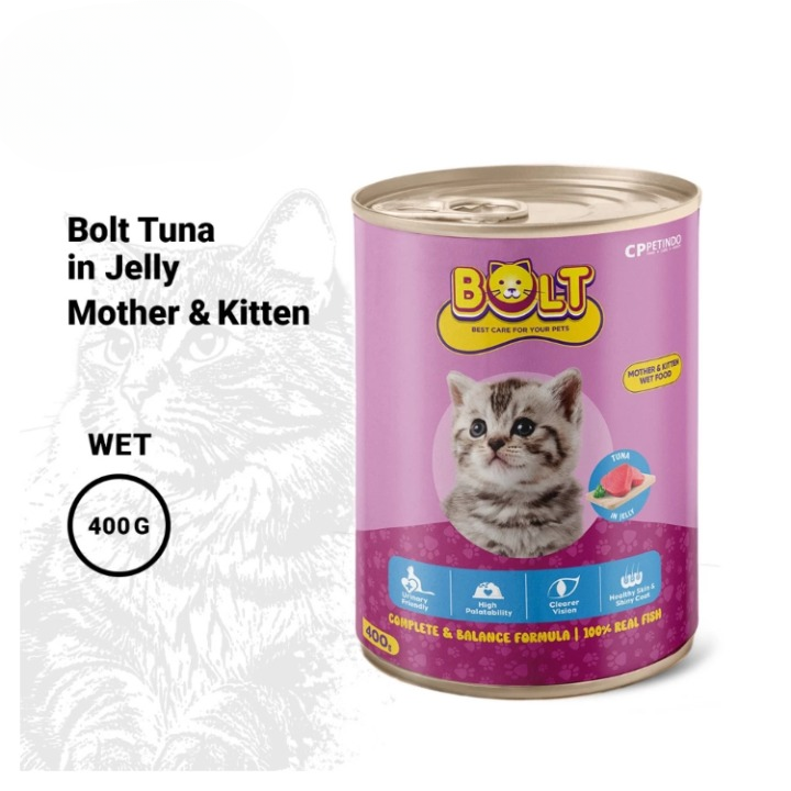 Bolt Mother & Kitten Tuna adalah pilihan tepat untuk memenuhi kebutuhan nutrisi yang sangat tinggi pada masa kehamilan, menyusui, dan pertumbuhan awal anak kucing. Dengan protein dari ikan tuna pilihan, makanan ini memberikan rasa yang lezat dan tekstur yang pas untuk lidah anak kucing.