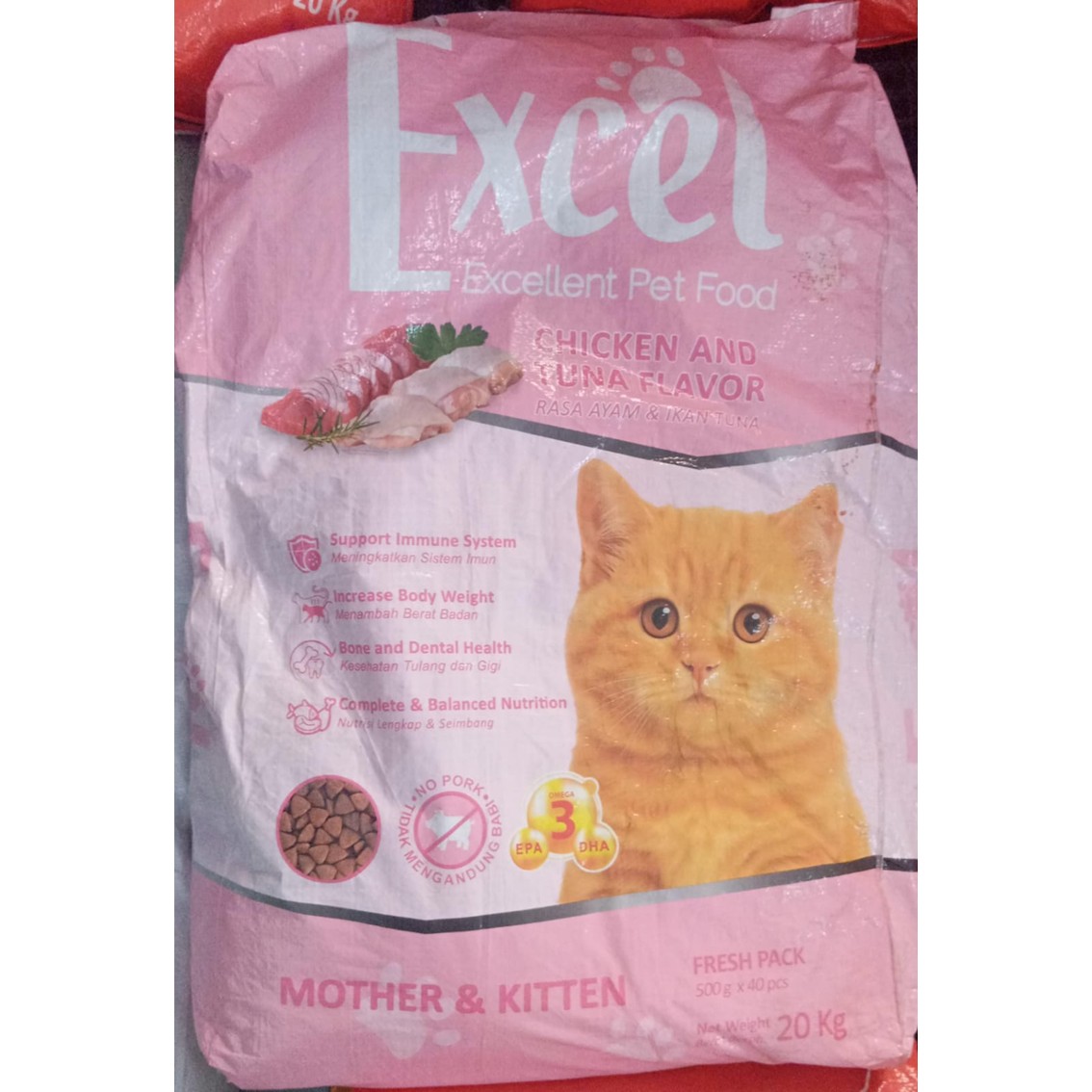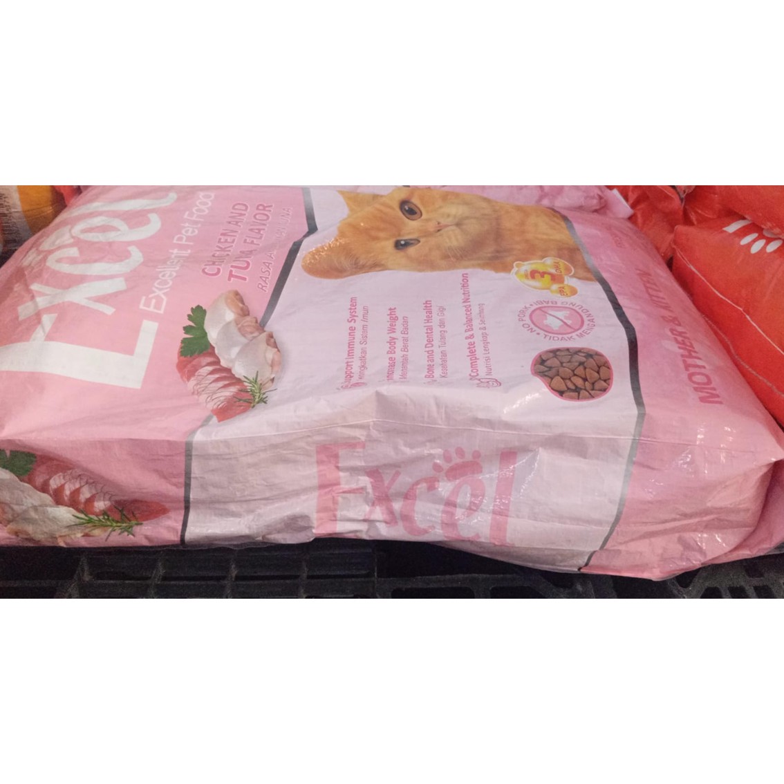 Excel MOTHER & KITTEN merupakan jajaran produk berkualitas tinggi menggunakan bahan baku impor berkualitas yang 100% alami. Protein tinggi berasal dari daging ayam dan ikan asli, kaya akan taurine, omega 3 dan 6 serta mineral yang baik bagi tubuh. EXCEL CAT merupakan makanan yang bergizi dan lezat bagi kebutuhan kucing Anda, di setiap tahap kehidupannya. Makanan kucing yang diformulasikan khusus untuk induk kucing hamil, induk kucing menyusui, dan anak kucing. Membantu menambah berat badan kucing.