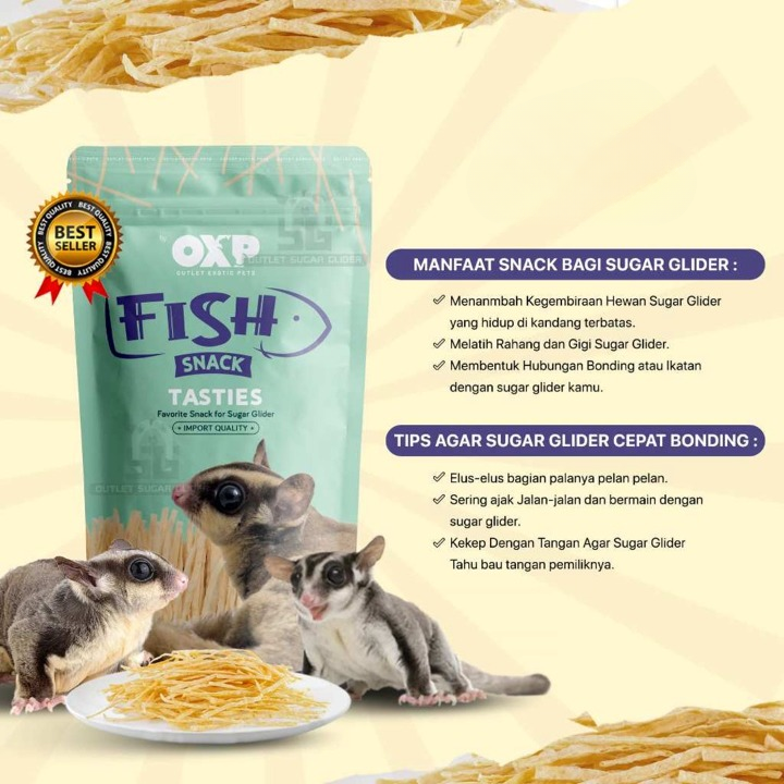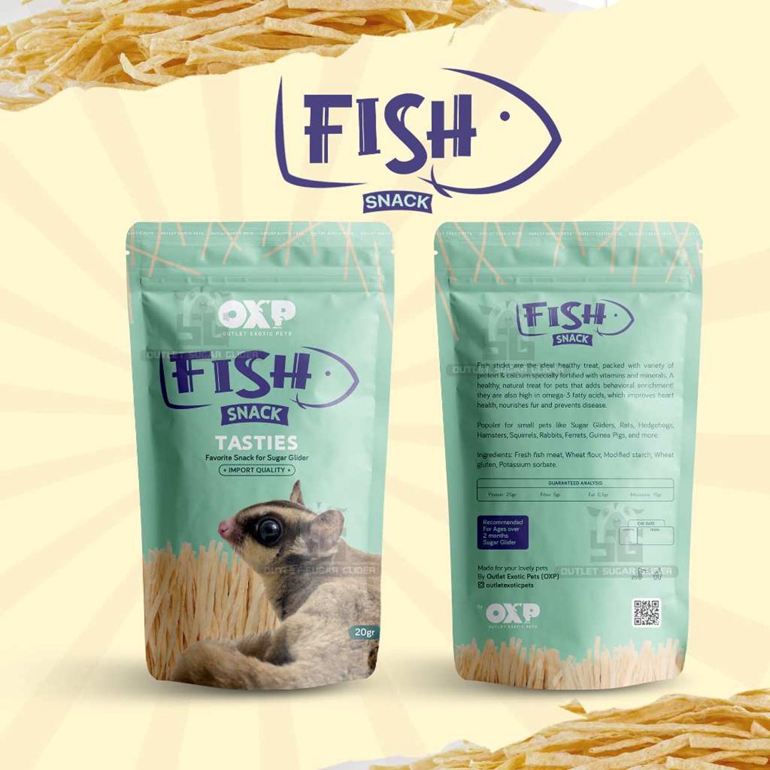 Fish Snack merupakan suatu makanan ringan yang di dalamnya ditambahkan ikan untuk meningkatkan nilai gizi. Makanan favorit sugar glider yang sudah digunakan para pecinta sugar glider. Snack ini bisa kita gunakan untuk cemilan atau makan tambahan sugar glider atau juga bisa dibawa ketika jalan-jalan dengan hewan kesayangan anda