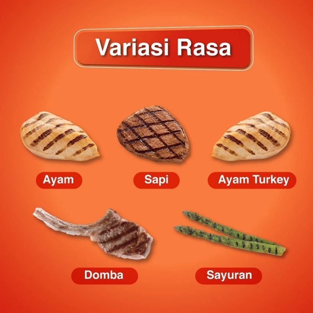Gabungan rasa Sapi, Ayam, Domba, Kalkun, dan Sayur-sayuran dalam satu kemasan.