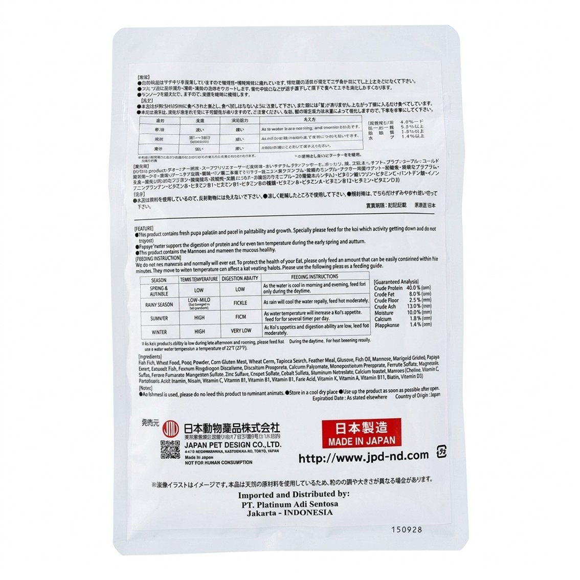 – Produk ini mengandung bubuk pupa segar dan unggul dalam palatabilitas dan pertumbuhan. Khususnya tolong beri pakan untuk koi yang aktivitasnya semakin menurun dan pola makannya kurang baik.