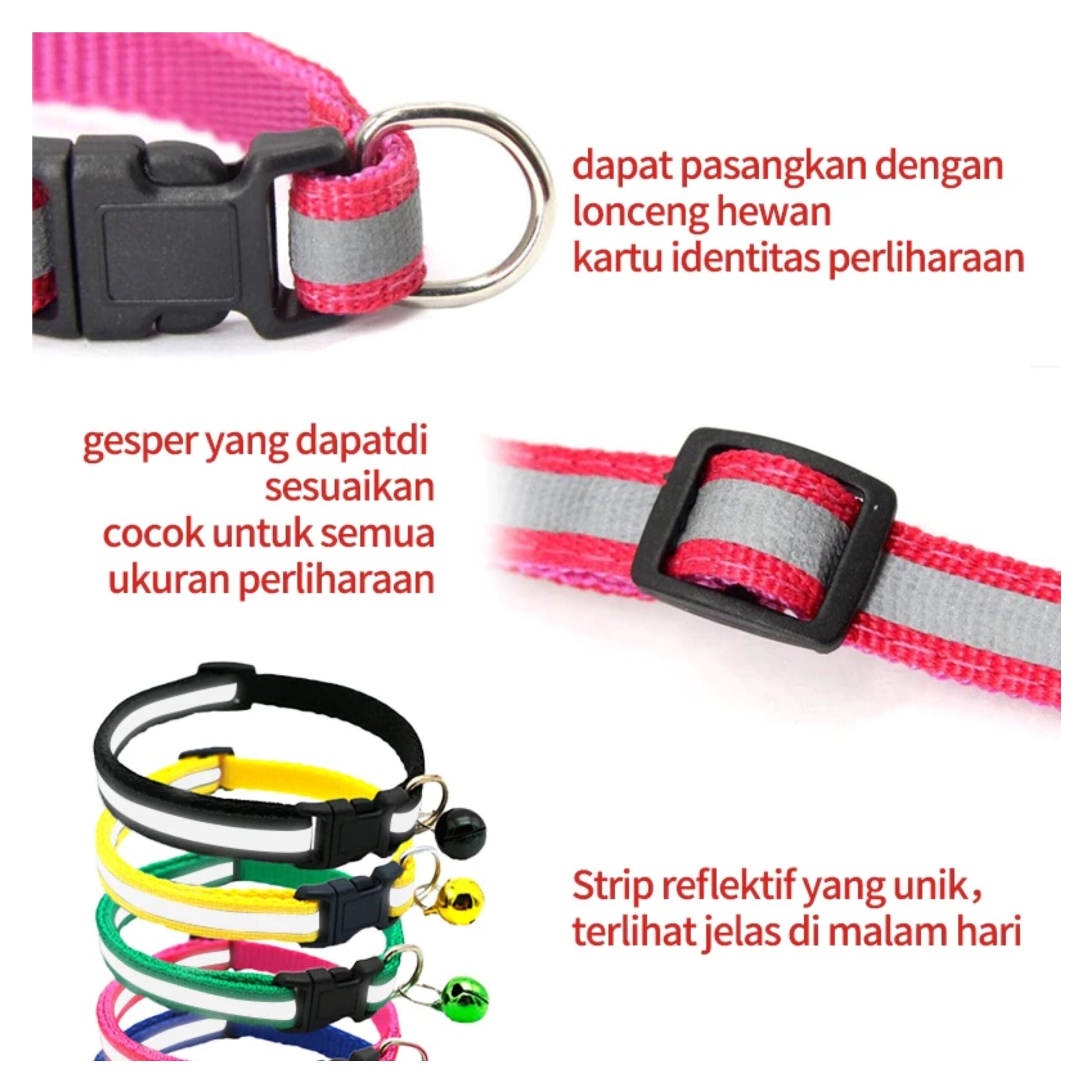 Kalung kucing polos berlonceng adjustable berfungsi untuk memasangkan lonceng dan tag identitas, memastikan ukuran pas dan nyaman, serta memberikan visibilitas malam hari karena adanya strip reflektif.