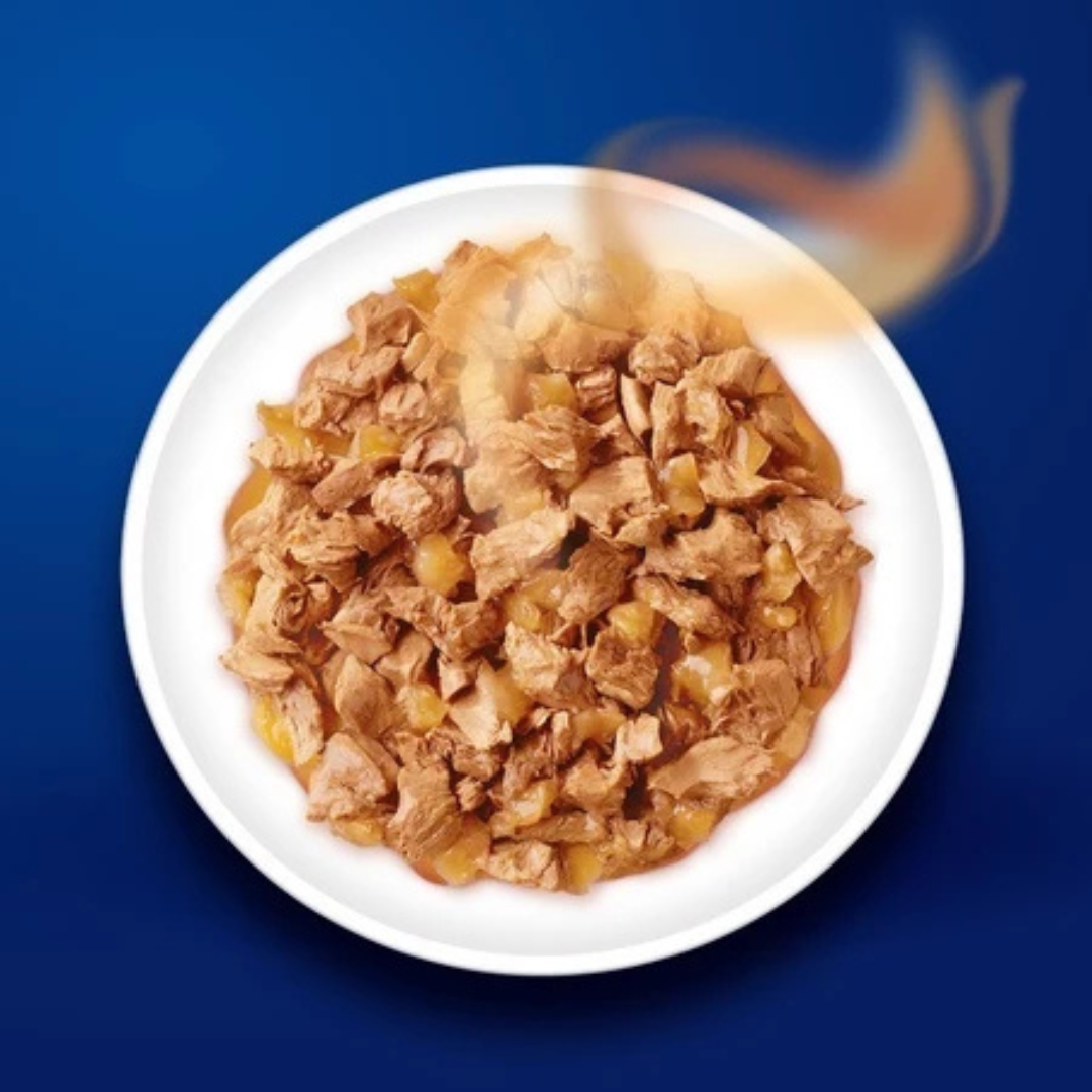 Berikan 2-3 pouch per hari (sesuaikan dengan berat badan dan tingkat aktivitas kucing). Sajikan pada suhu ruang untuk aroma yang maksimal.