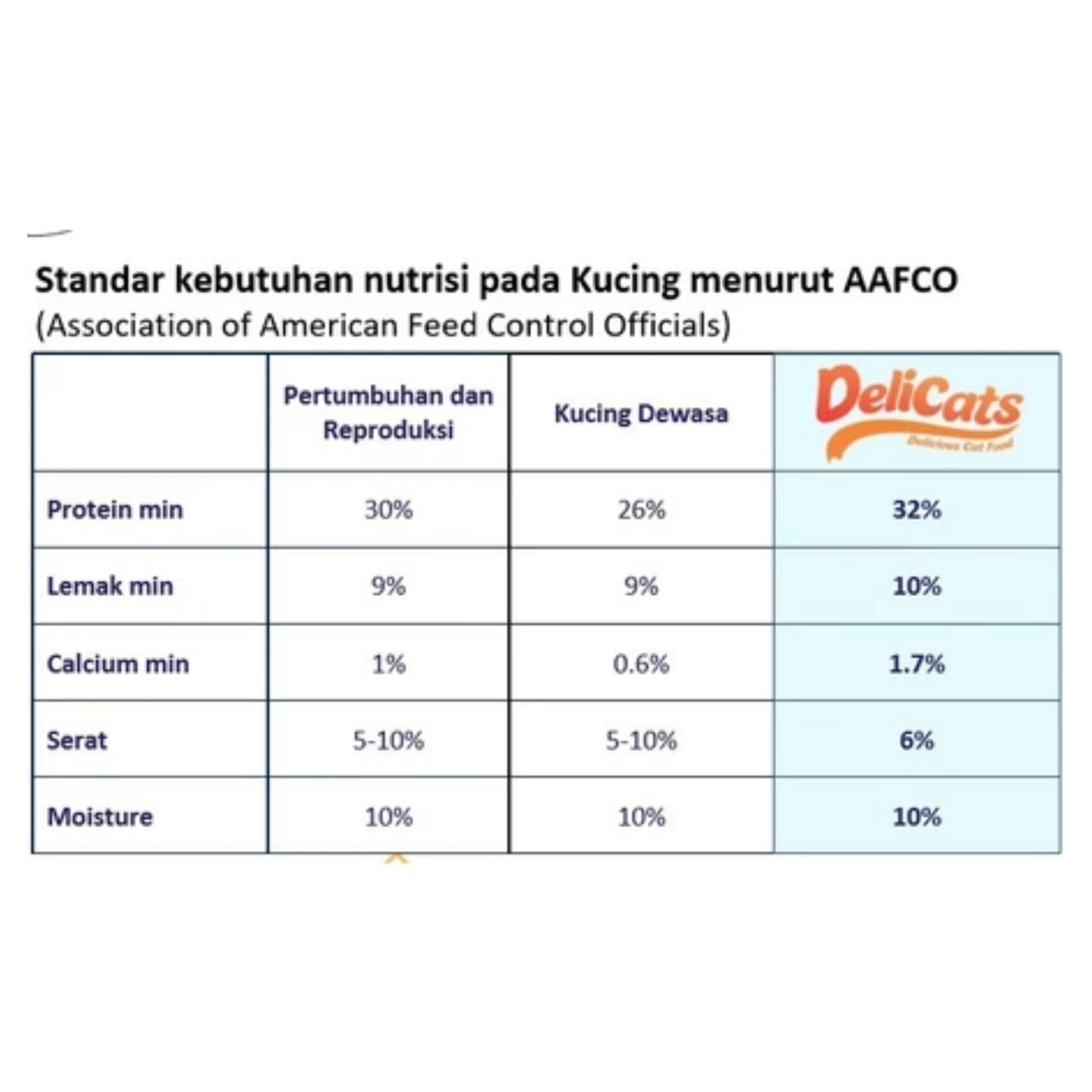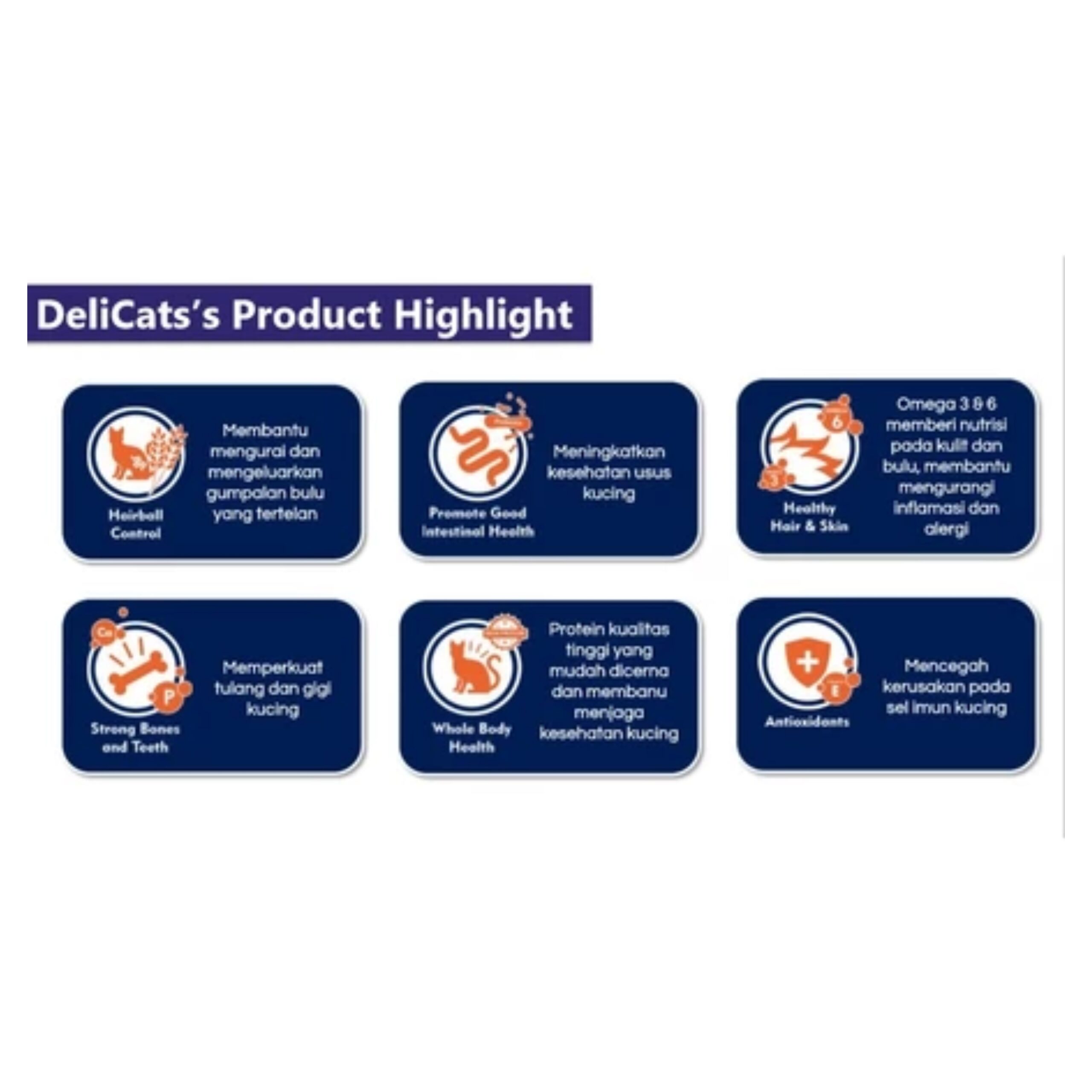Delicats Tuna adalah pakan kucing lengkap dan seimbang yang diformulasikan khusus untuk memenuhi kebutuhan nutrisi kucing dewasa (adult).