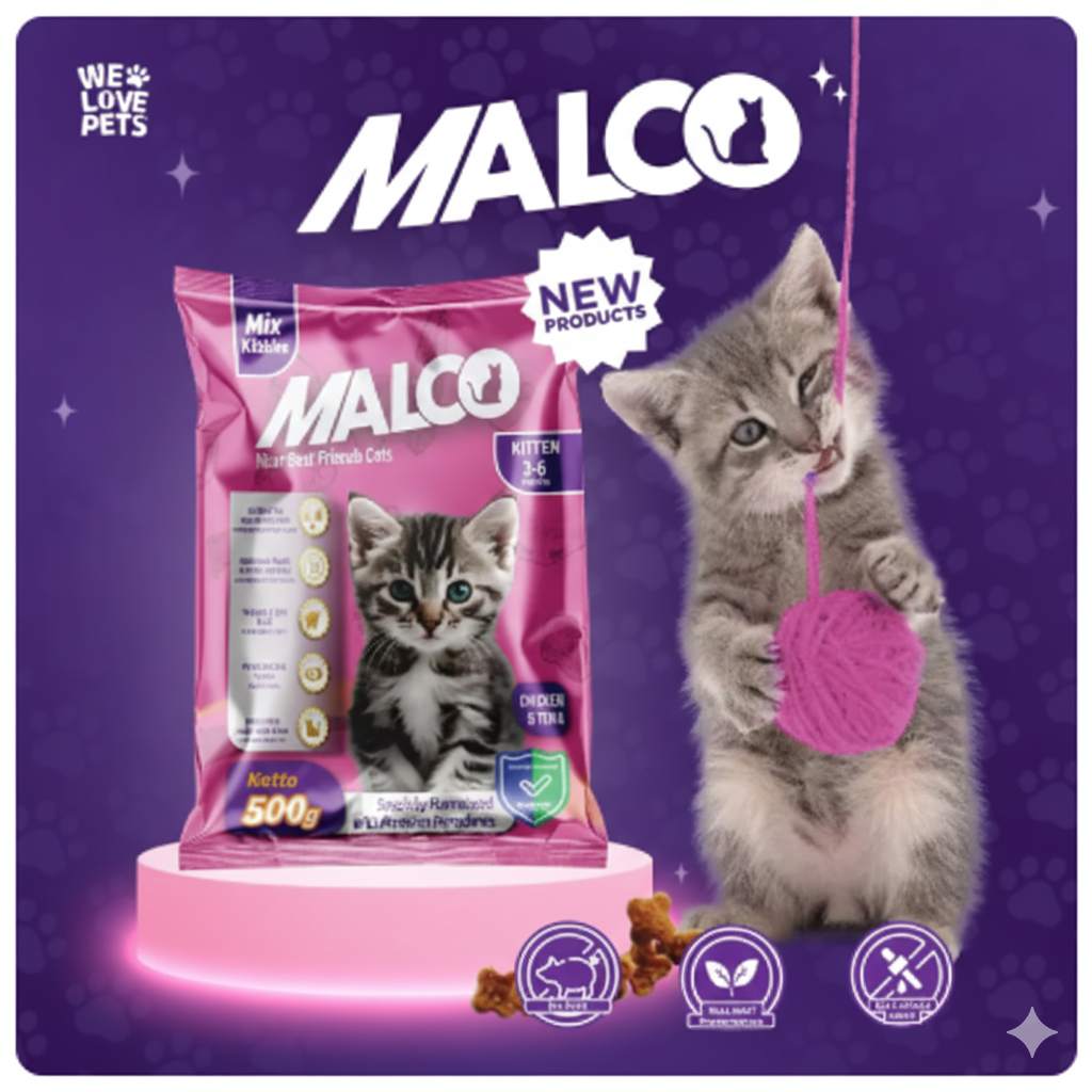 Malco Kitten 500gr adalah makanan kucing kering (dry food) yang diformulasikan secara khusus untuk mendukung pertumbuhan optimal anak kucing.