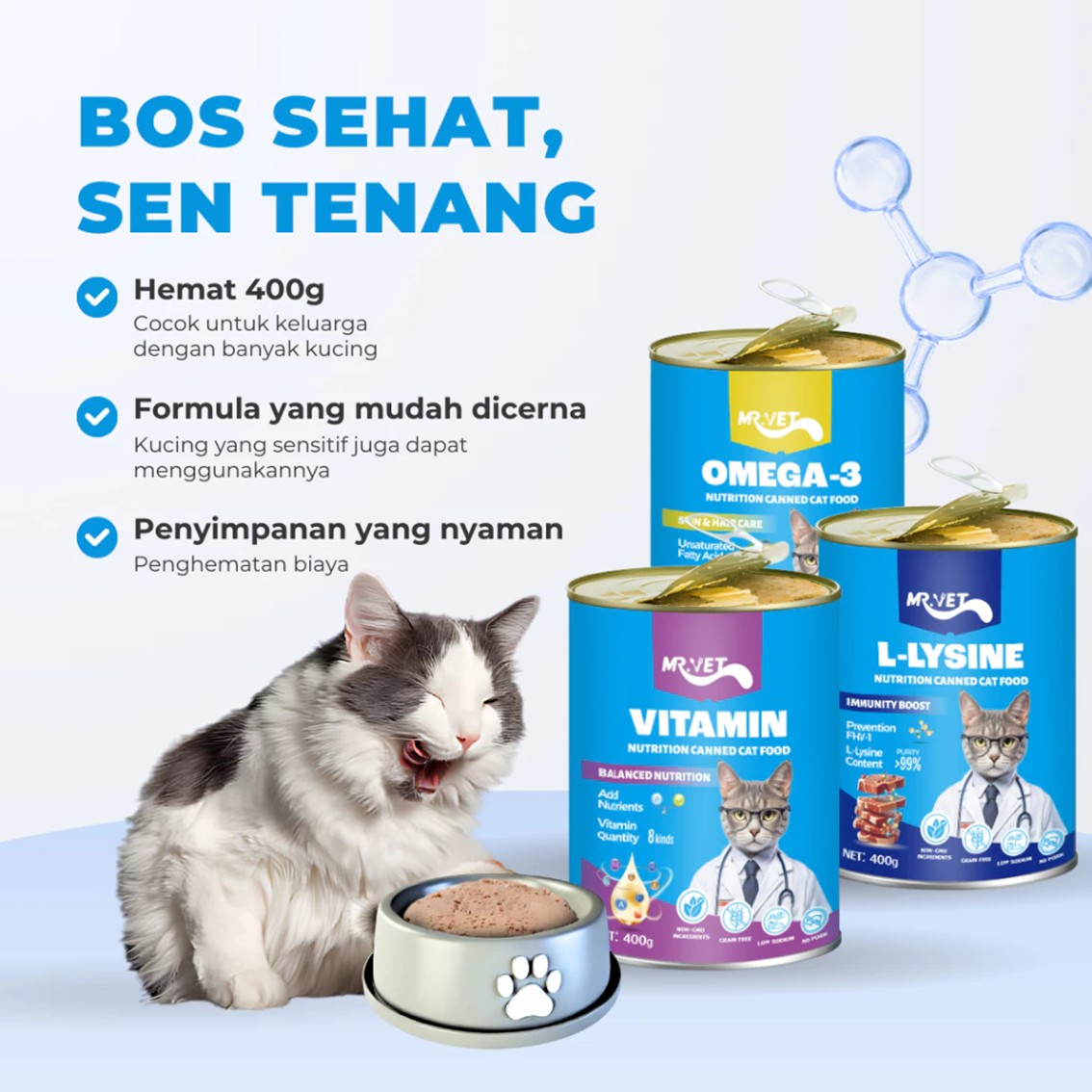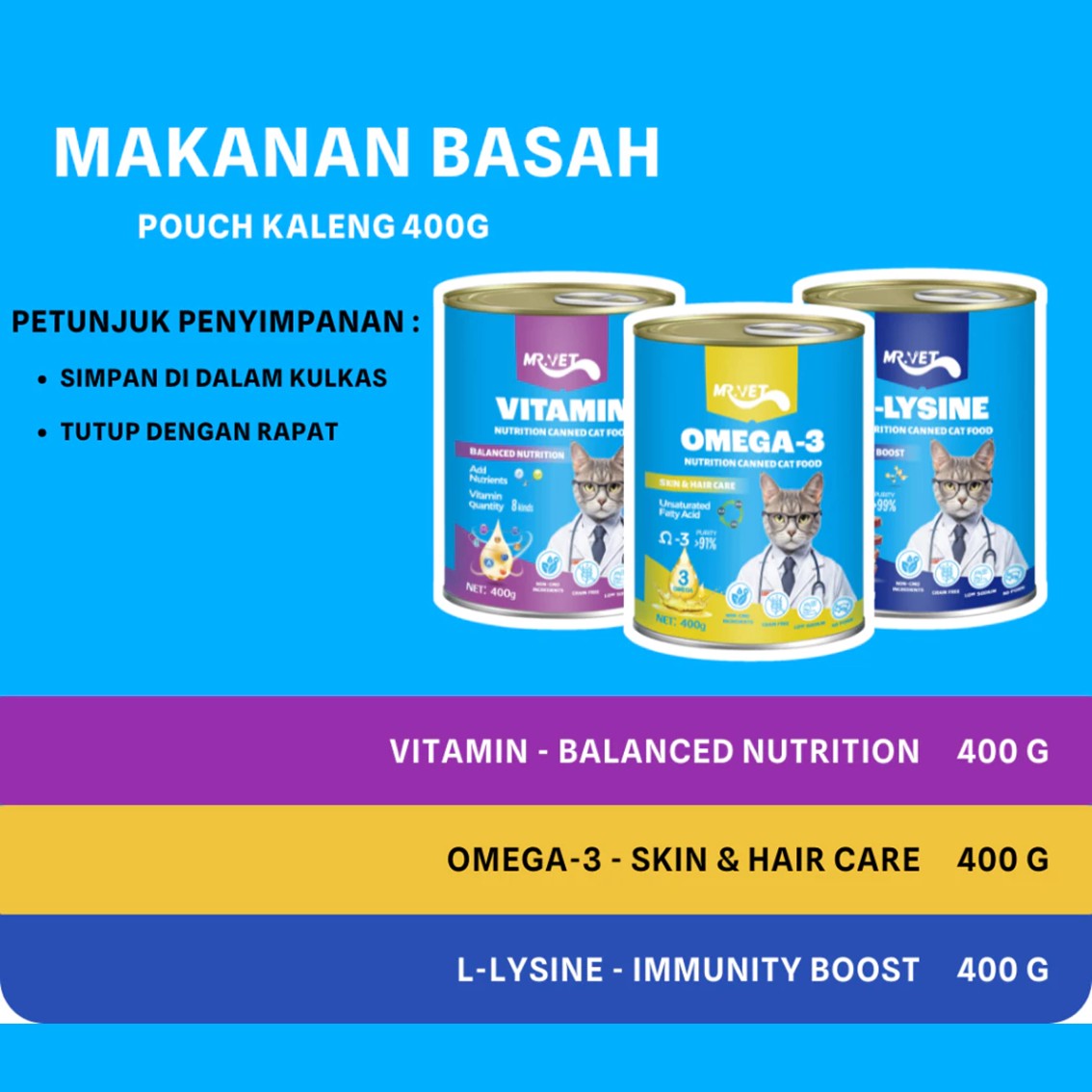 Jaga kesehatan anabul dari serangan virus dengan Mr Vet L-Lysine 400gr. L-Lysine adalah asam amino esensial yang direkomendasikan oleh dokter hewan untuk meningkatkan sistem kekebalan tubuh, terutama dalam melawan virus Feline Herpesvirus (penyebab utama flu kucing).