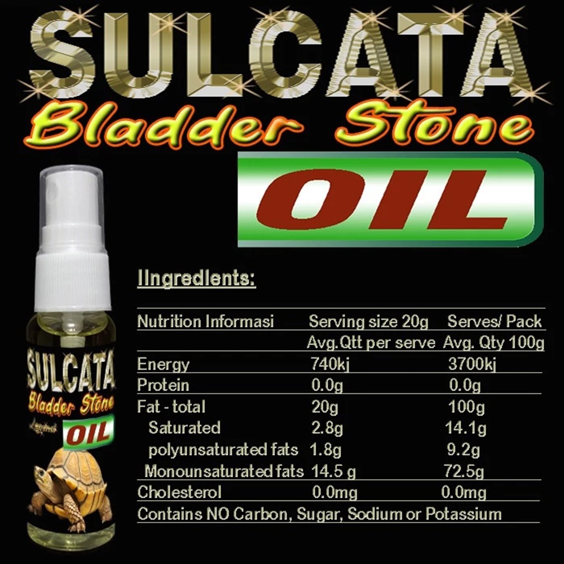 Sulcata Bladder Stone Oil adalah solusi premium “All-in-One” yang diformulasikan khusus untuk menjaga kesehatan kura-kura darat Anda secara menyeluruh. Terbuat dari bahan-bahan alami yang aman digunakan setiap hari, minyak ini berfungsi sebagai suplemen makanan sekaligus perawatan luar (tempurung & kulit).