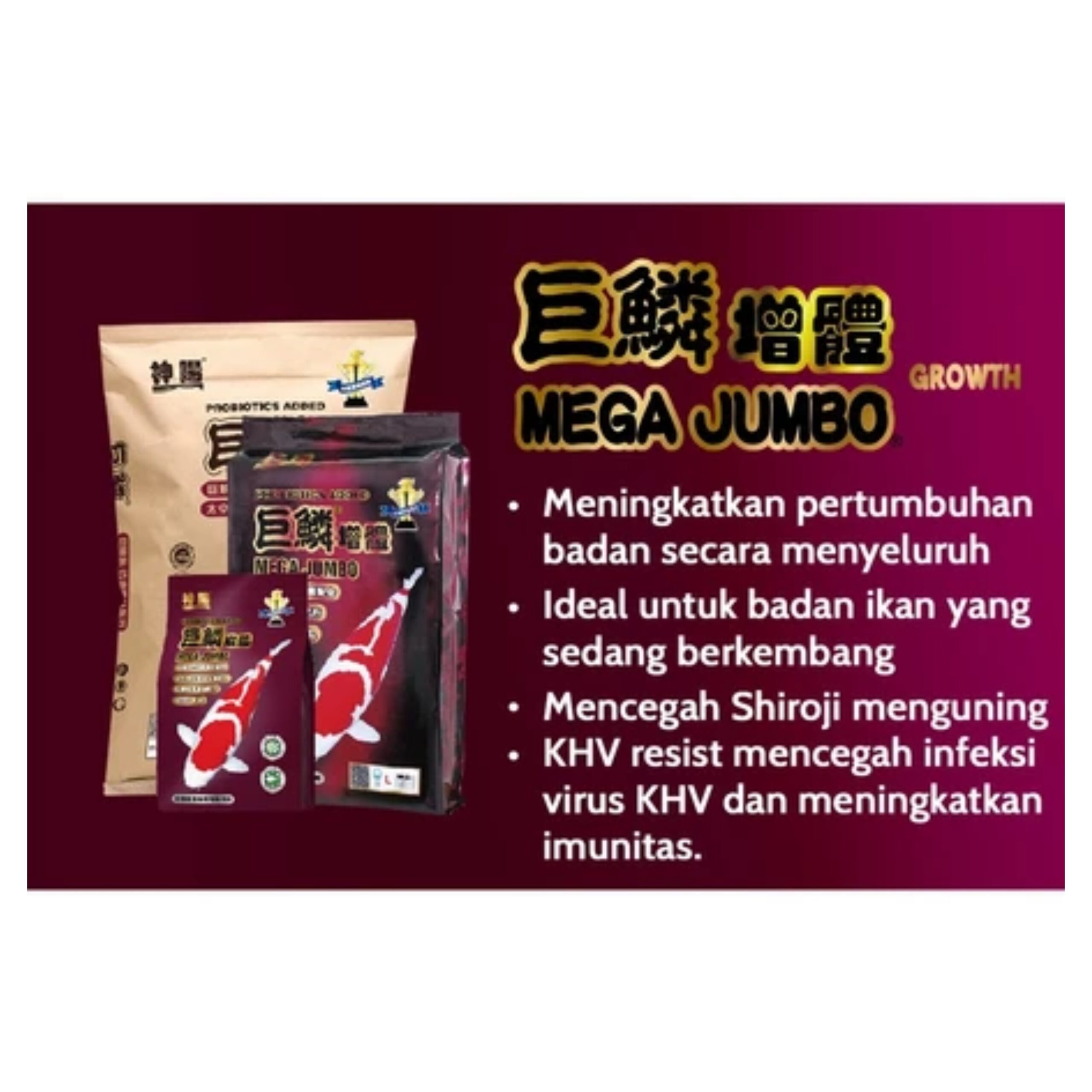 Mega Jumbo Growth mengandung kalsium aktif premium untuk meningkatkan tingkat pertumbuhan tubuh koi hingga 60%. Dengan adanya nutrisi yang seimbang, menjaga usus koi tetap sehat dan meningkatkan kilau. Memberikan penyerapan unggul, mencapai pertumbuhan cepat ke ukuran tubuh koi. Ditambahkan probiotik, sangat memperkuat kemampuan pencernaan.