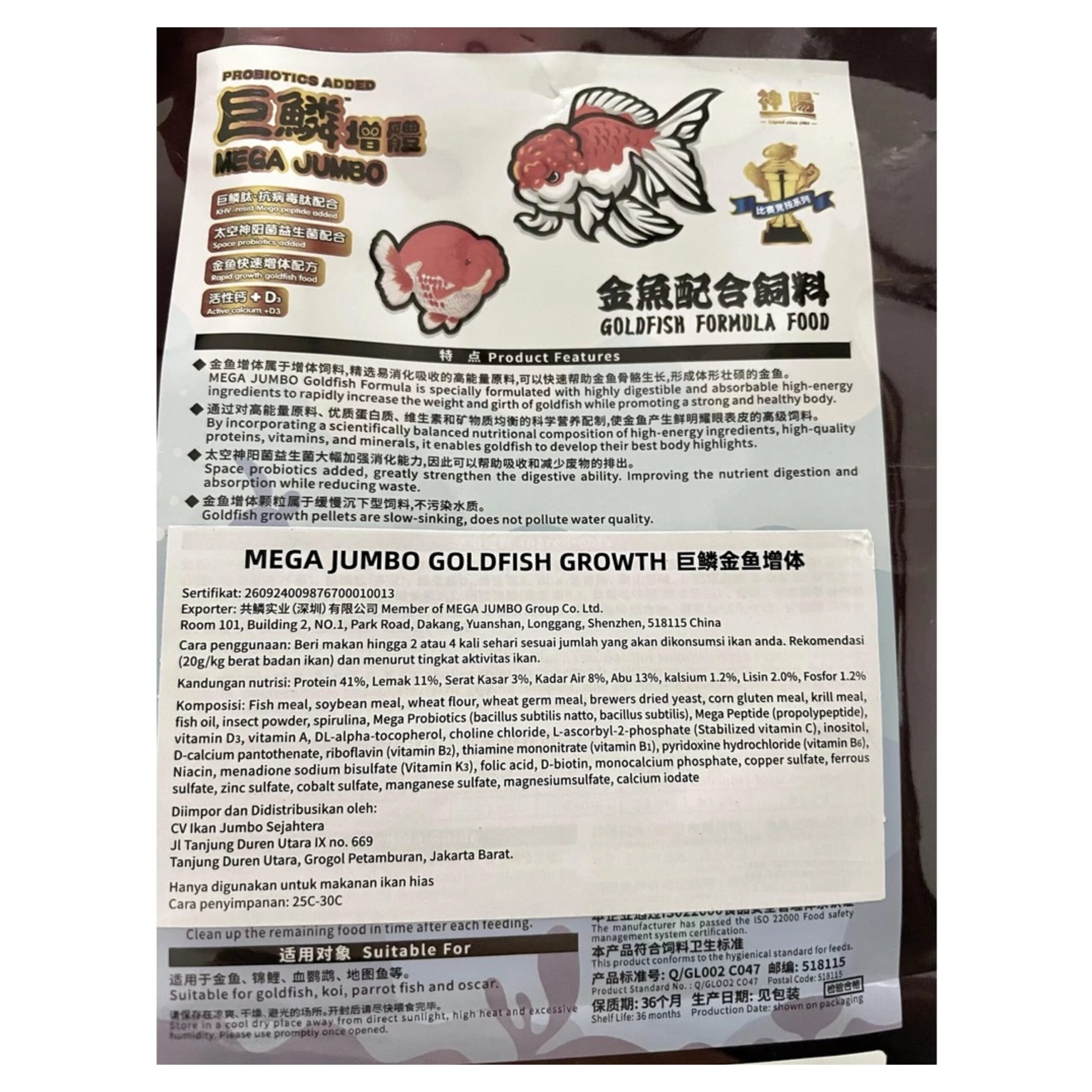 Formula Mega Jumbo Goldfish diformulasikan secara khusus dengan bahan-bahan berenergi tinggi yang sangat mudah dicerna dan diserap untuk meningkatkan berat ikan mas secara cepat sambil mendorong tubuh yang kuat dan sehat.