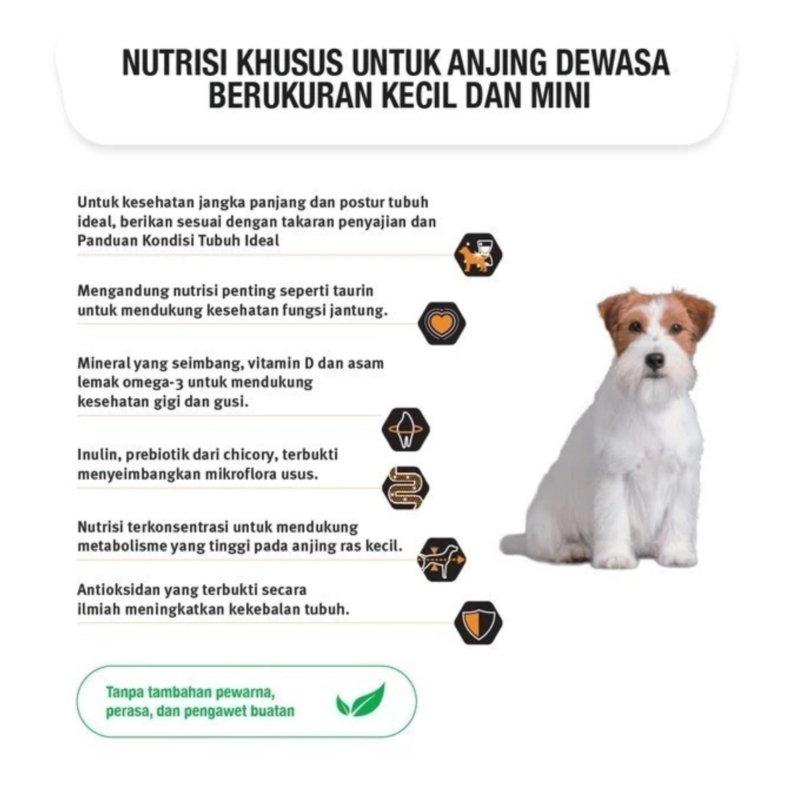 – Nutrisi terkonsentrasi untuk mendukung metabolisme yang tinggi pada anjing ras kecil.
