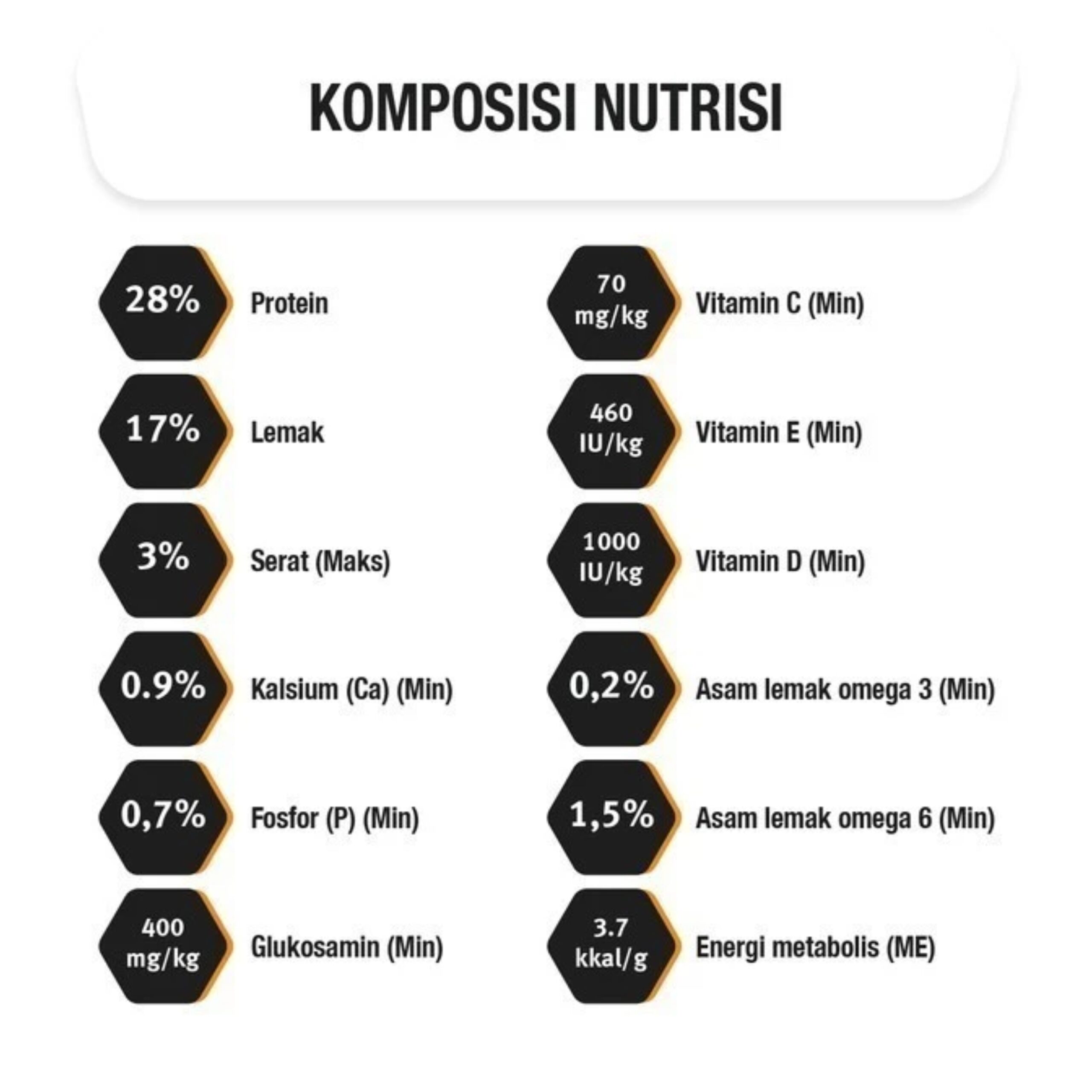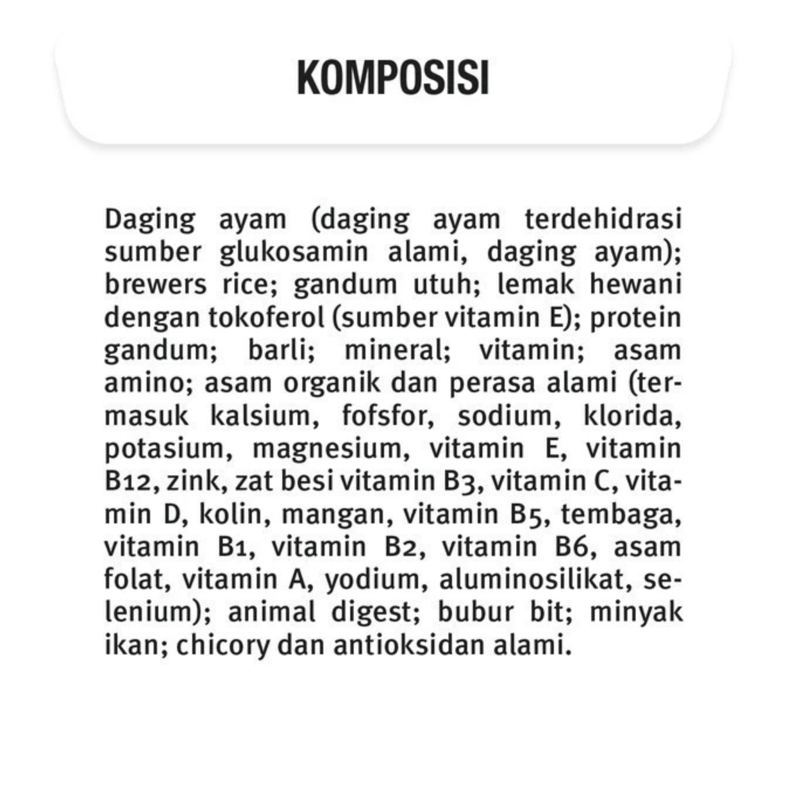 Daging ayam (daging ayam terdehidrasi sumber glukosamin alami, daging ayam); brewers rice; gandum utuh; lemak hewani dengan tokoferol (sumber vitamin E); protein gandum; barli; mineral; vitamin; asam amino; asam organik dan perasa alami (termasuk kalsium, fofsfor, sodium, klorida, potasium, magnesium, vitamin E, vitamin B12, zink, zat besi vitamin B3, vitamin C, vitamin D, kolin, mangan, vitamin B5, tembaga, vitamin B1, vitamin B2, vitamin B6, asam folat, vitamin A, yodium, aluminosilikat, selenium); animal digest; bubur bit; minyak ikan; chicory dan antioksidan alami.