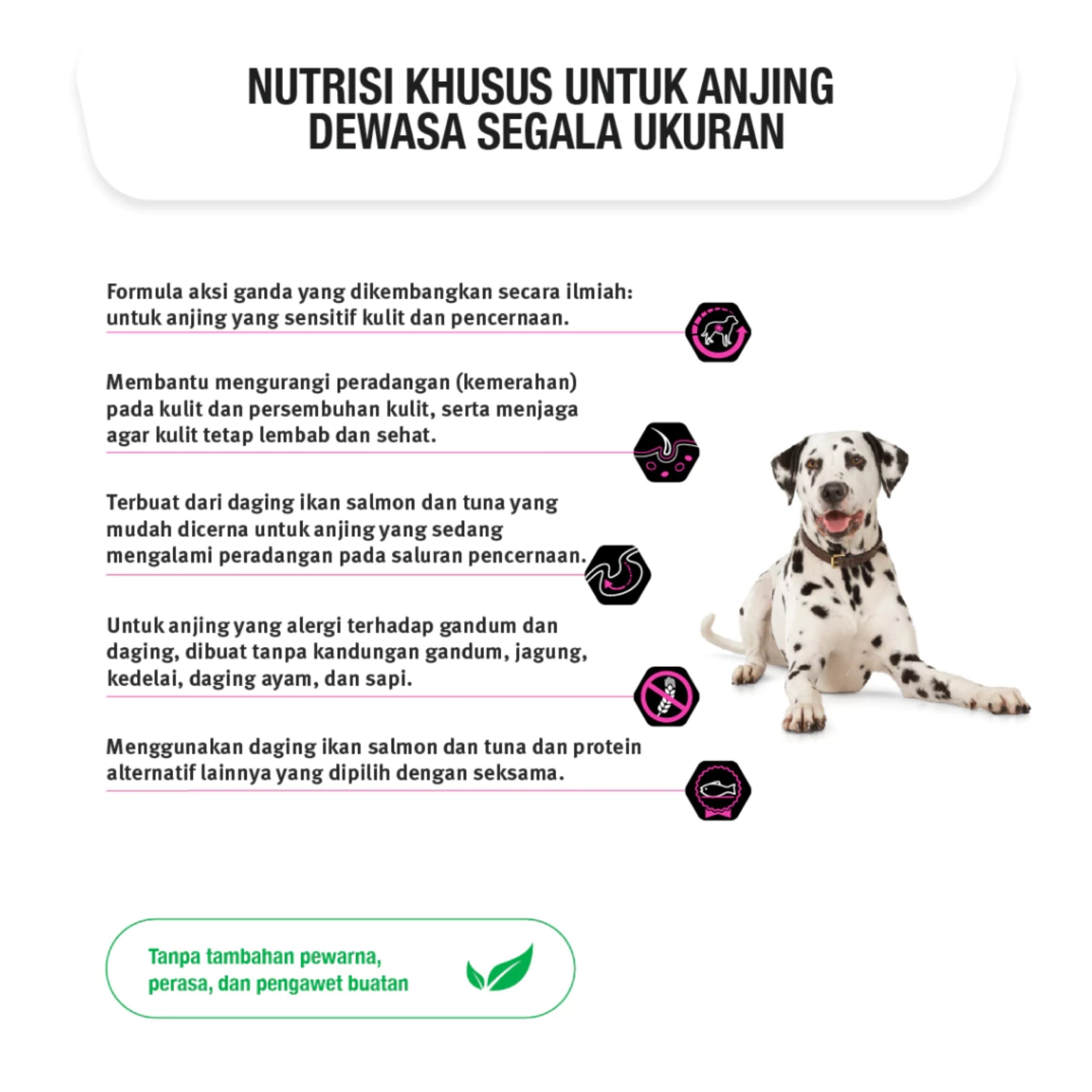 – Formula aksi ganda yang dikembangkan secara ilmiah : untuk anjing yang sensitif kulit dan pencernaan