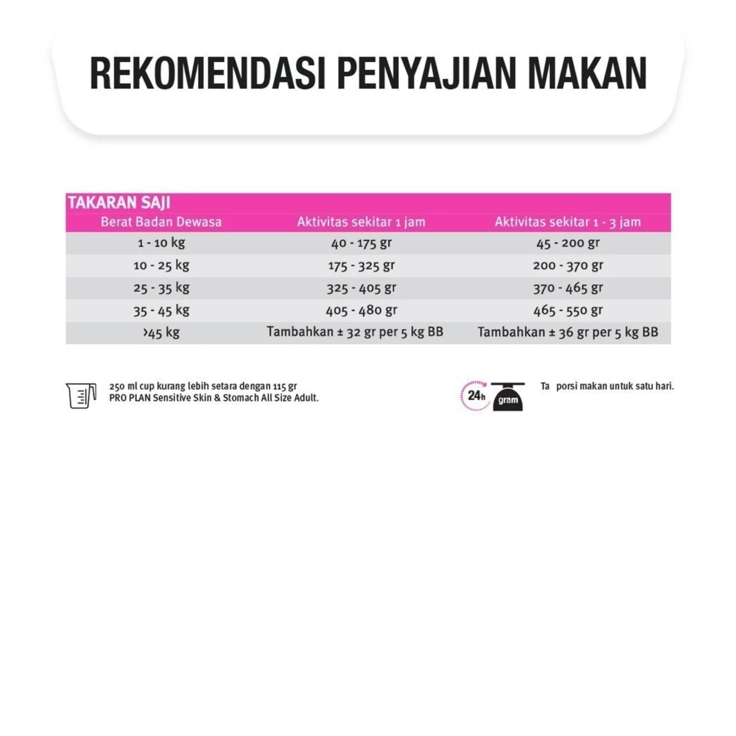 Layaknya manusia, beberapa anjing terlahir lebih sensitif dibanding lainnya. Saat intoleransi makanan terjadi, sistem imunita bereaksi negatif pada bahan-bahan yang aman seperti ayam, daging, kedelai, jagung dan gandum. PRO PLAN Dog Adult Sensitive Skin & Stomach All Size Salmon Tuna telah teruji klinis membantu menurunkan resiko reaksi negatif perut pada makanan, dan kombinasi nutrisinya dapat membantu kondisi kulit dan kesehatan perut anjing Anda. Makanan yang lengkap dan seimbang untuk anjing dewasa segala ukuran. PRO PLAN Dog Adult Sensitive Skin & Stomach Medium & Large Salmon Mackarel diformulasikan untuk membantu mengurangi resiko alergi makanan. Merupakan produk kombinasi untuk menjaga kesehatan kulit dan perut.