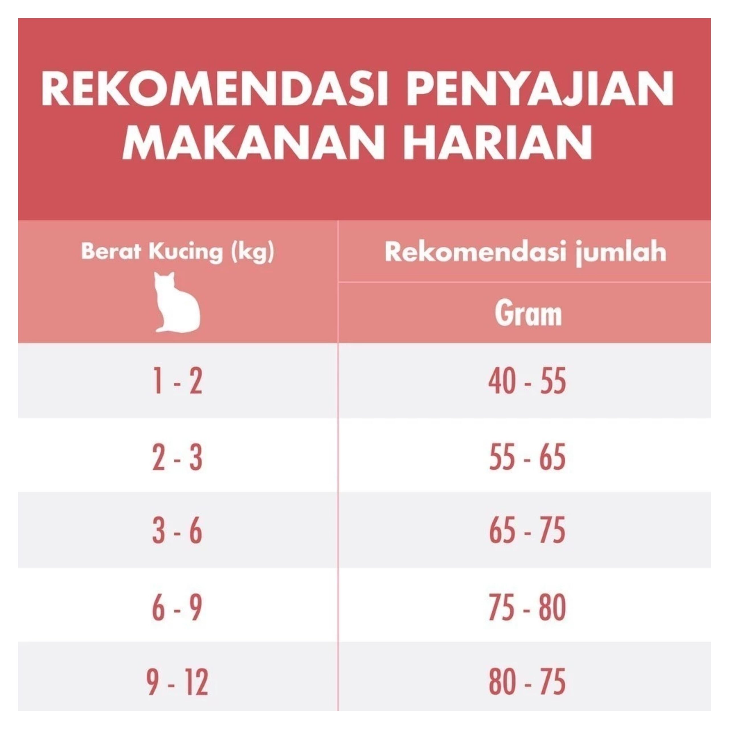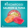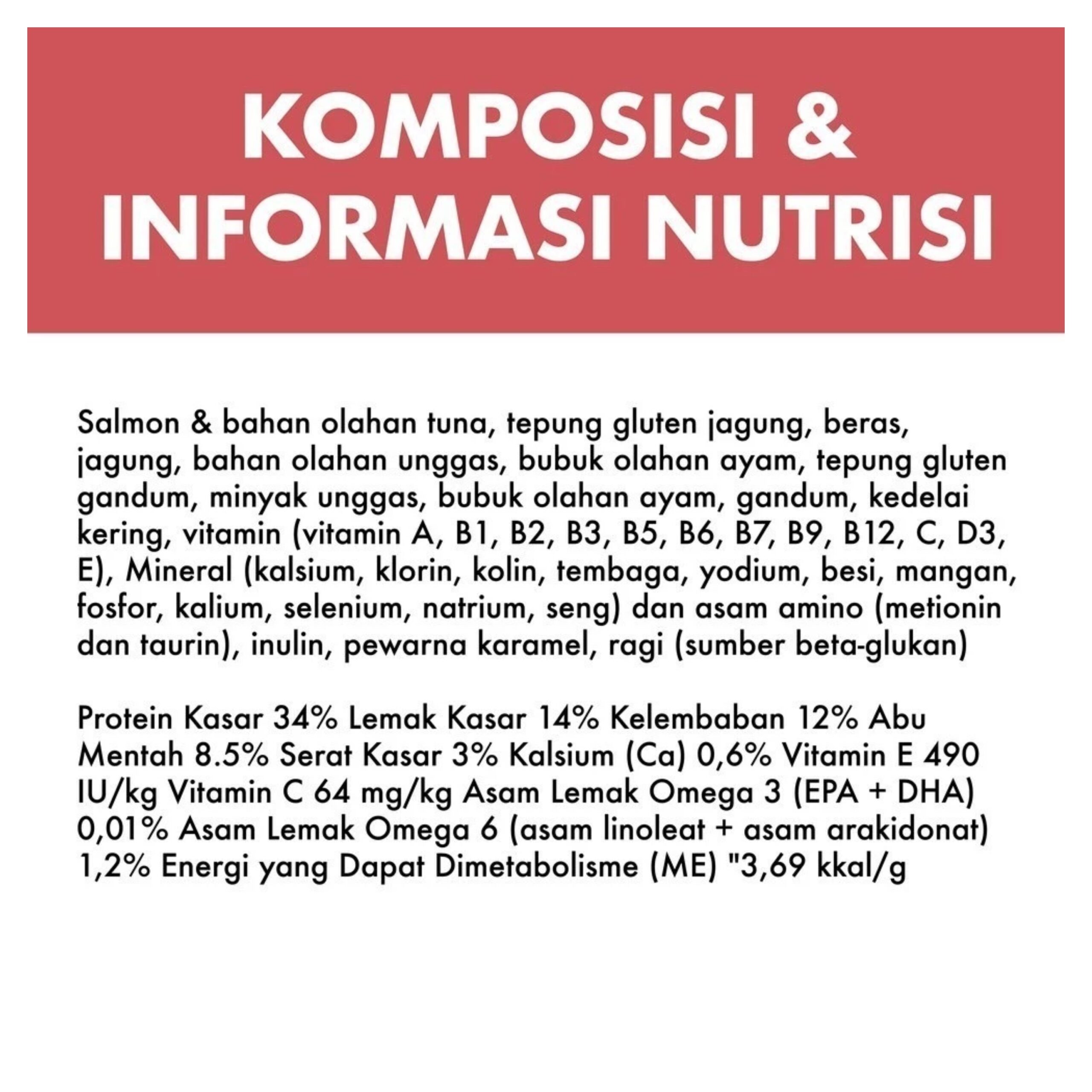 – Bahan Berkualitas Tinggi: Menggunakan Salmon & Tuna asli sebagai kualitas bahan nomor 1 untuk mendukung penyerapan nutrisi yang optimal.