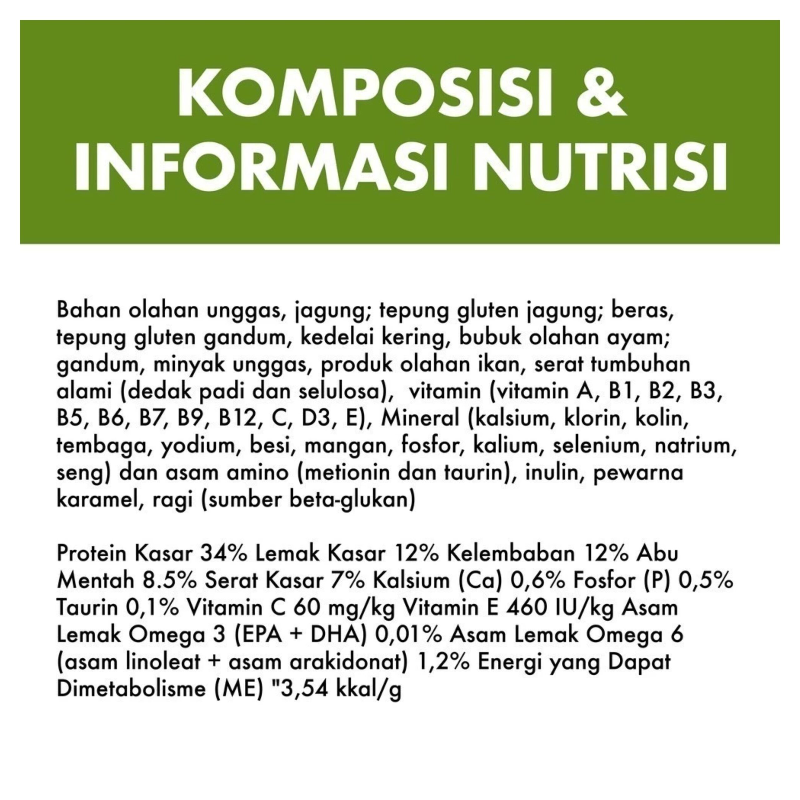 – Kontrol Hairball: Dibuat dengan kandungan serat tinggi untuk membantu mengurangi terbentuknya gumpalan rambut (hairball).