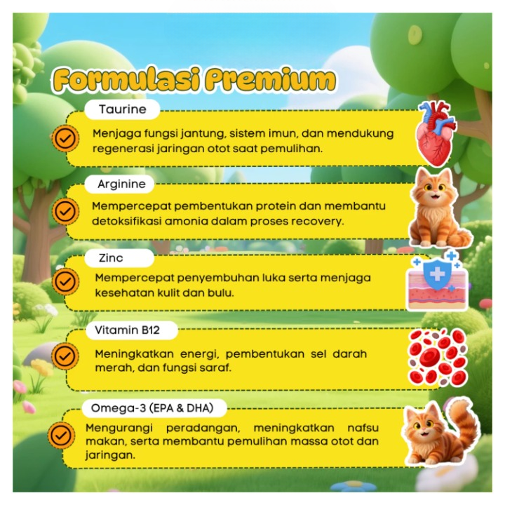 – Recovery (Pemulihan): Sangat baik diberikan untuk hewan pasca sakit atau setelah operasi agar stamina cepat kembali.