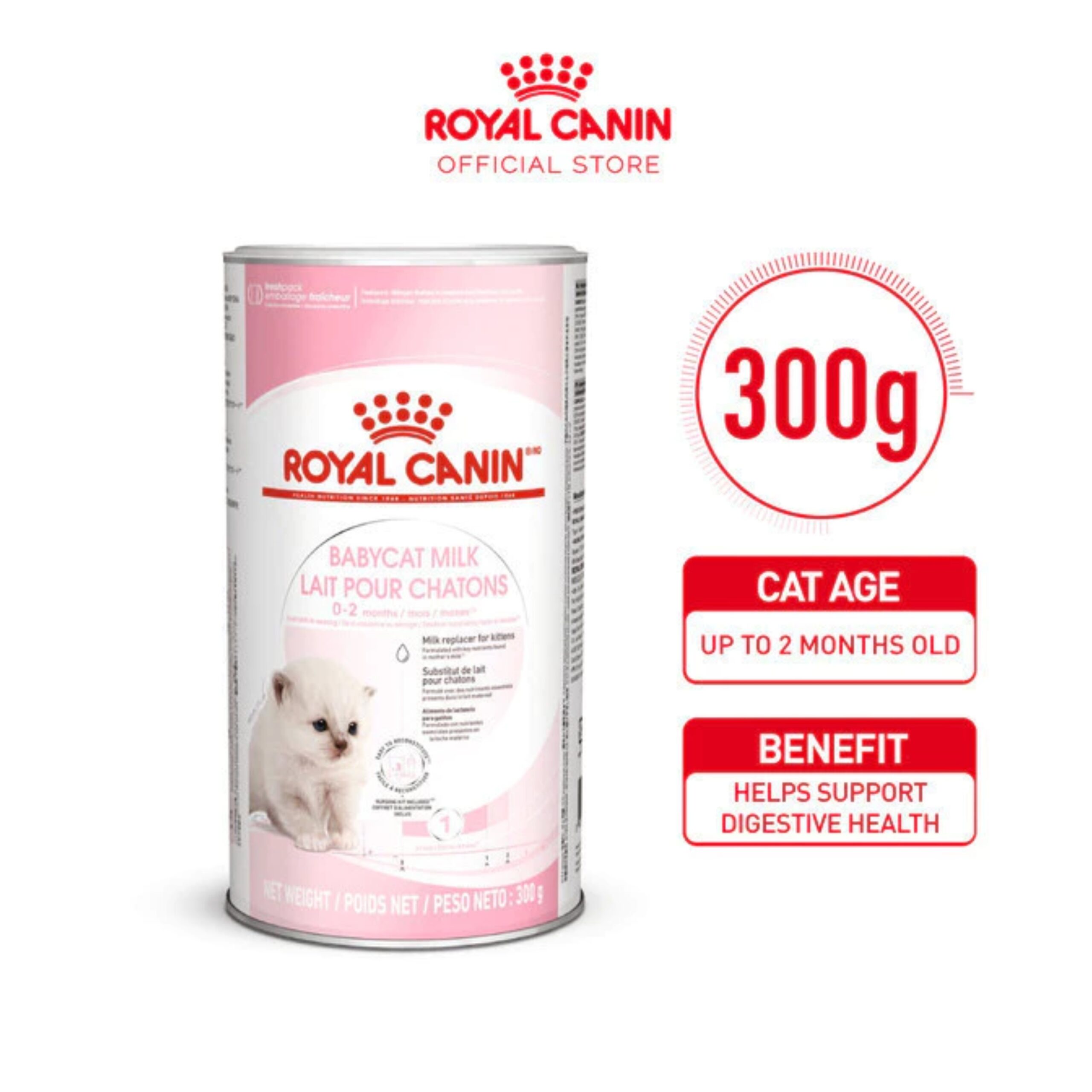 Royal Canin Baby Cat Milk 300gr merupakan susu pengganti yang diformulasikan untuk anak kucing atau kitten yang baru lahir dan masih disapih. Mengandung nutrisi penting yang disesuaikan dengan ASI indukan sehingga mudah dicerna dan menjamin pencernaan yang sehat. Sangat cocok diberikan pada kitten berusia 0-1 bulan yang kehilangan indukan atau ketika indukan menolak memberi makan pada anak kucing Anda.