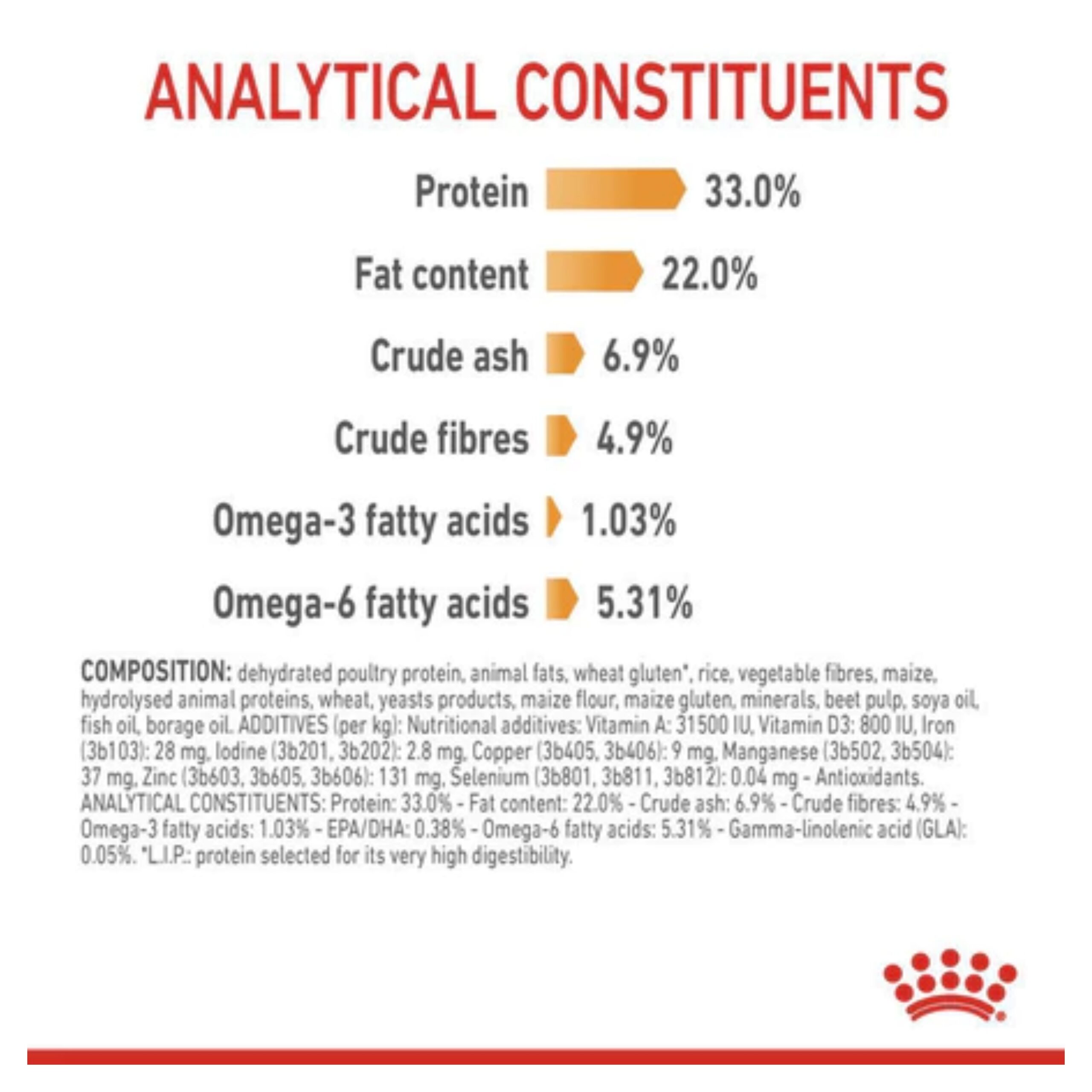 Daging unggas yang dikeringkan, beras, lemak hewani, isolat protein nabati*, jagung, serat nabati, gluten jagung, protein hewani yang dihidrolisis, ragi, bubur bit, minyak kedelai, minyak ikan, mineral, tepung telur, minyak borage, ekstrak marigold (sumber lutein).