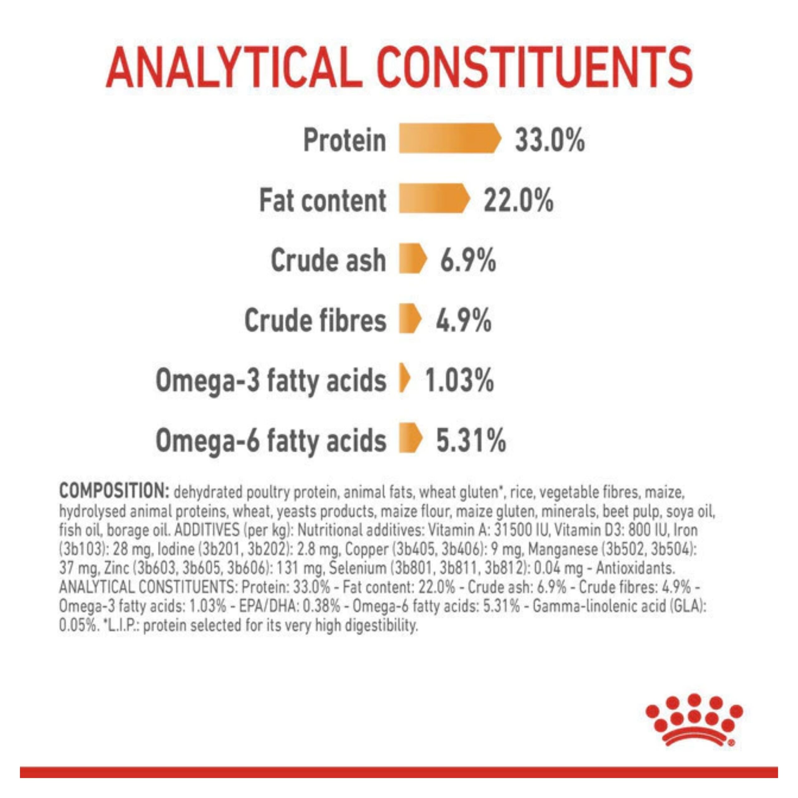 Daging unggas yang dikeringkan, beras, lemak hewani, isolat protein nabati*, jagung, serat nabati, gluten jagung, protein hewani yang dihidrolisis, ragi, bubur bit, minyak kedelai, minyak ikan, mineral, tepung telur, minyak borage, ekstrak marigold (sumber lutein).