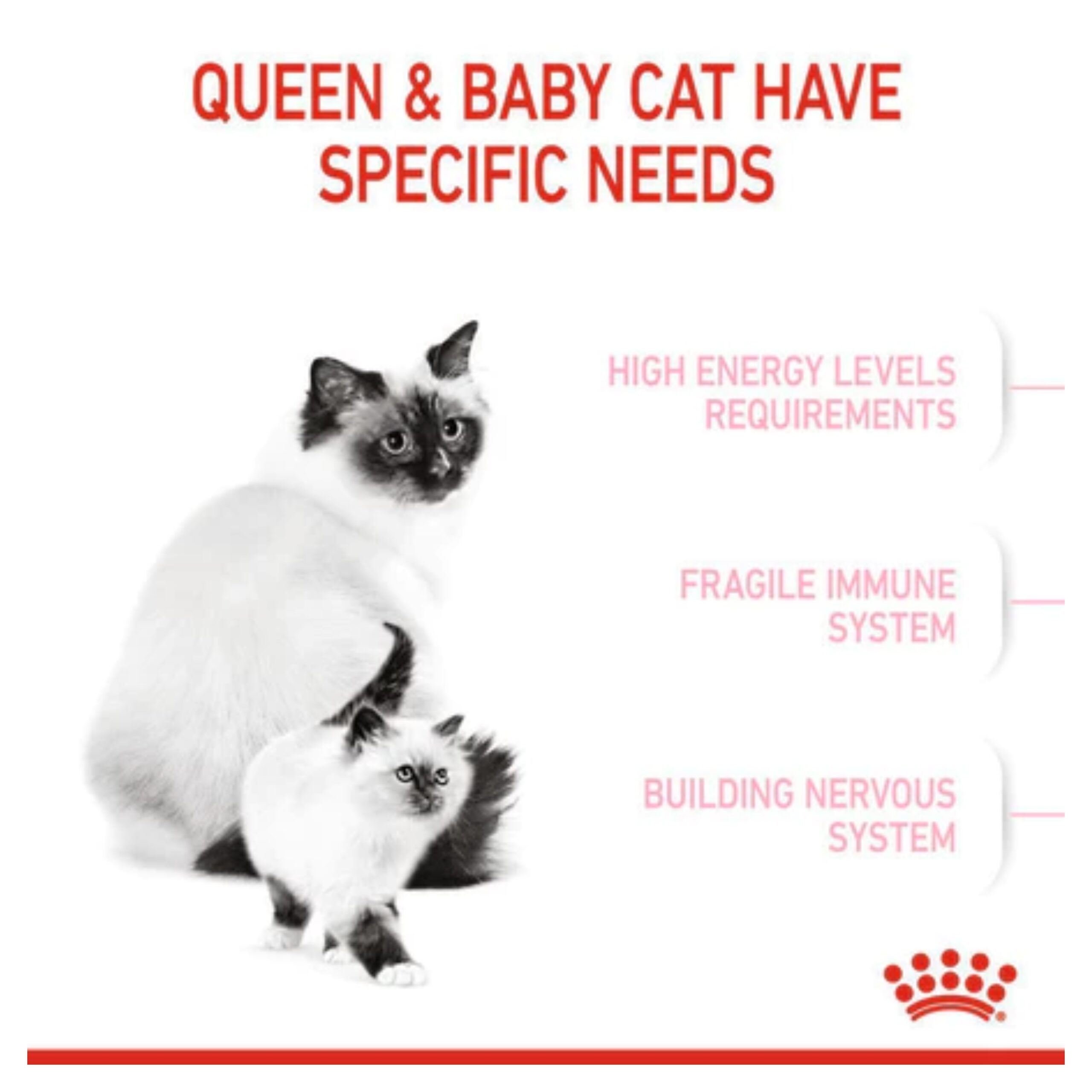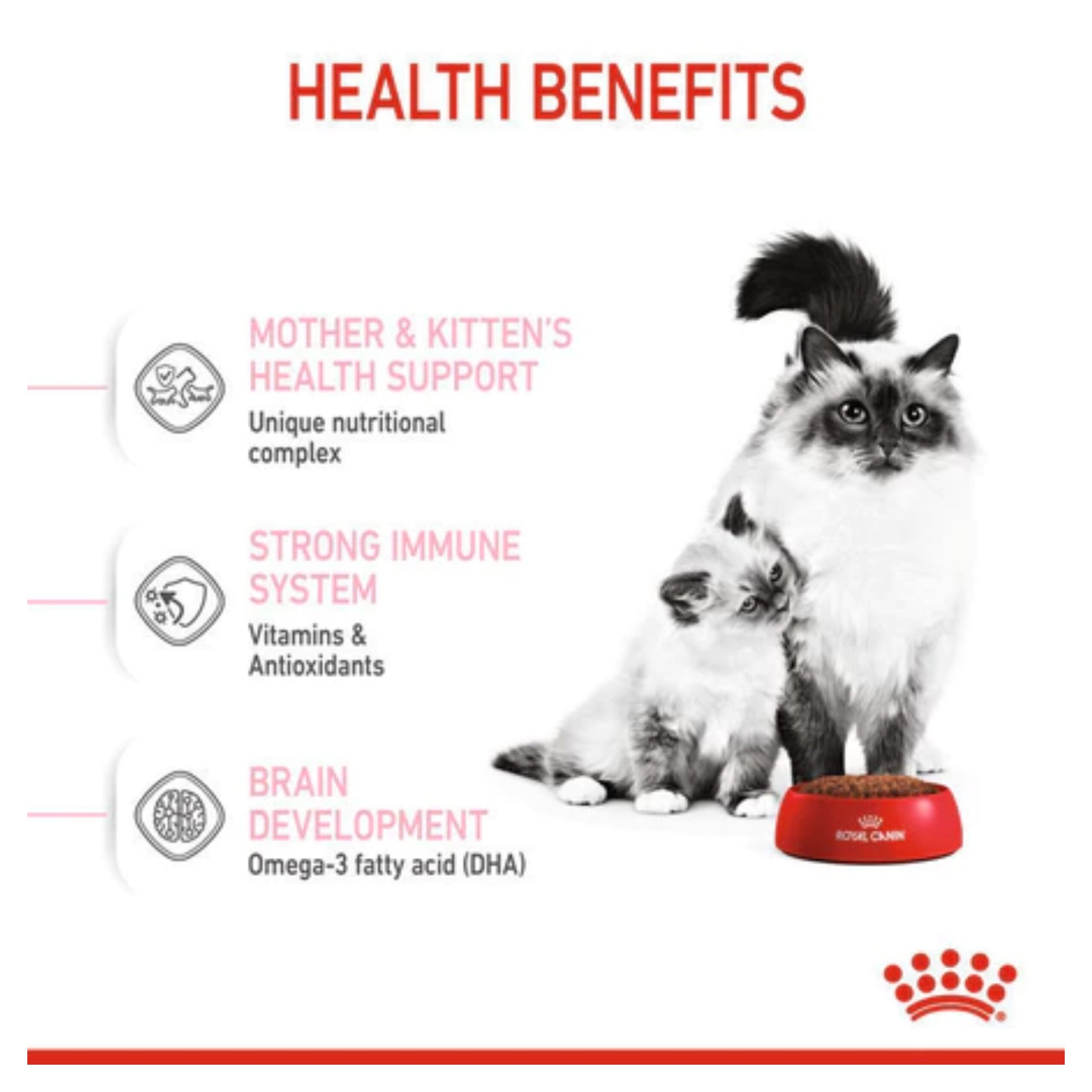 Royal Canin Mother and Baby Cat diformulasikan dengan ultra lembut sehingga sangat memudahkan anak kucing yang dalam masa transisi perubahan dari susu ke makanan padat. Kandungan Mannan-Oligosakarida dan antioksidan kompleks seperti vitamin E dan C, Taurin, dan Lutein yang membantu membangun sistem imunitas kucing tahap pertama.