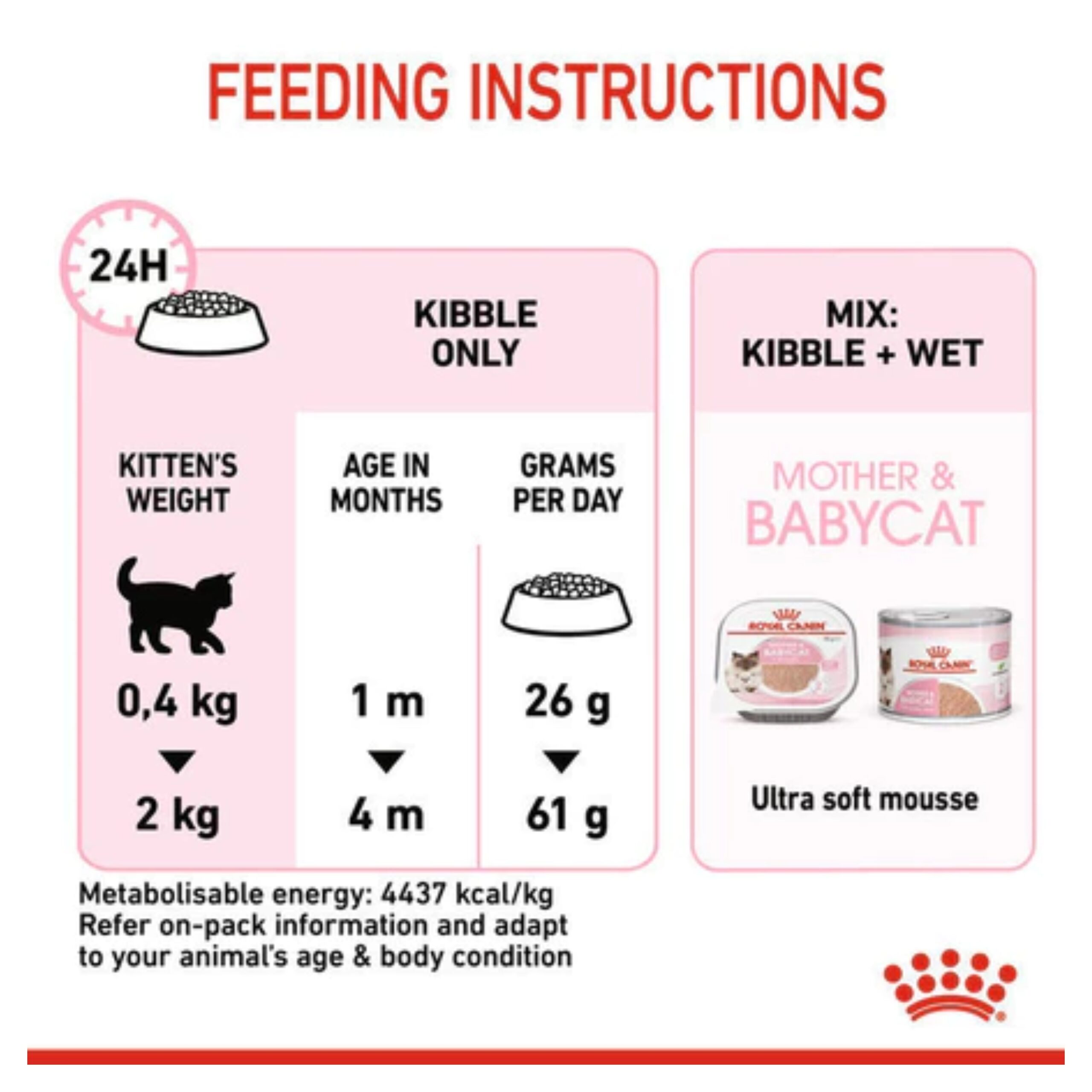 Royal Canin Mother and Baby Cat atau RC 34 merupakan makanan yan diformulasikan secara khusus untuk anak kucing dalam masa pertumbuhan dan juga indukannya. Royal Canin sangat memperhatikan kebutuhan gizi, nutrisi dan kesehatan kucing kesayang anda, sehingga sangat memperhatikan parameter tersebut sesuai dengan kebutuhan usia, ras, gaya hidup dan juga keadaan individual kucing.