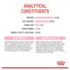 Dehydrated poultry protein, animal fats, maize flour, rice, vegetable protein isolate, yeast and parts throaf, fish oil, beet pulp, vegetable fibres, soya oil, mineral, etc.