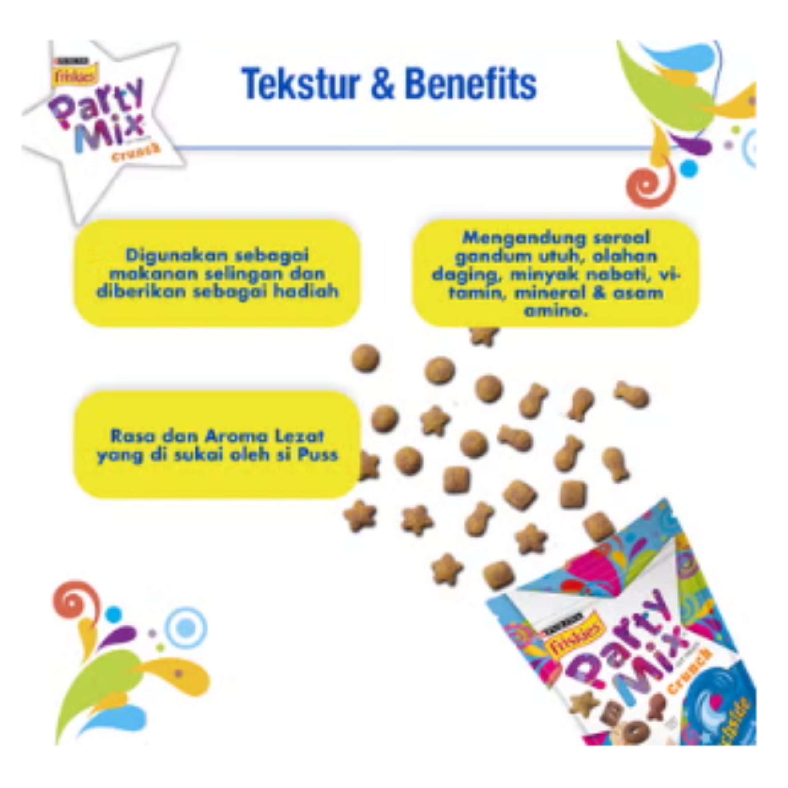 Friskies Party Mix adalah camilan kering yang renyah dan penuh rasa, dirancang untuk diberikan sebagai hadiah atau makanan pendamping di antara waktu makan. Hadir dalam berbagai bentuk dan warna yang menarik, membuat sesi snack time kucing Anda semakin seru!
