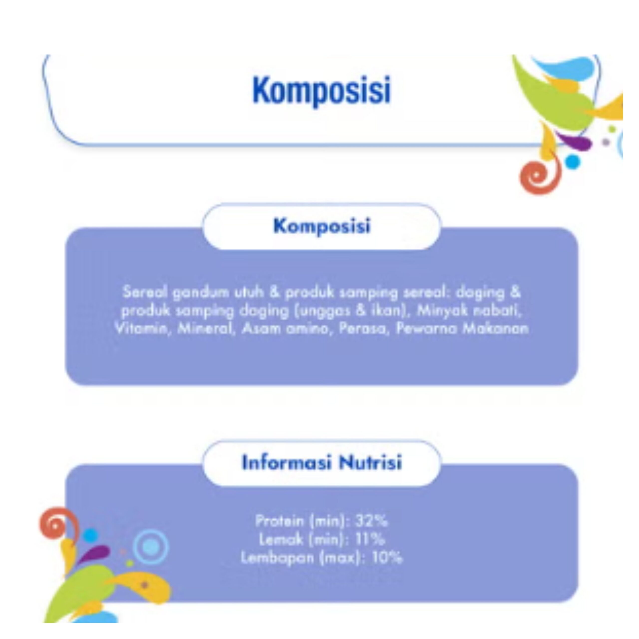Komposisi: Sereal gandum utuh & produk samping sereal: daging & produk samping daging (unggas dan/sapi, dan/ikan), Minyak nabati, Vitamin, Mineral, Asam amino, Perasa, Pewarna Makanan,