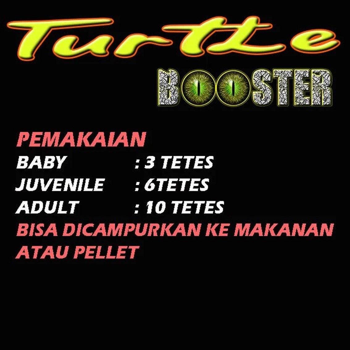 Turtle Booster adalah solusi lengkap untuk kesehatan kura-kura air kesayangan Anda (Res, CST, MST, Ambon, dll). Diformulasikan dengan mikroorganisme baik untuk menjaga ekosistem pencernaan kura-kura tetap sehat, sehingga penyerapan nutrisi menjadi lebih efektif dan pertumbuhan pun jadi lebih pesat.