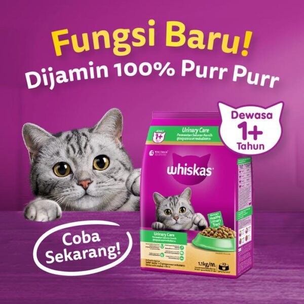 Perkenalkan WHISKAS Makanan Kucing untuk Perawatan Saluran Kemih, perpaduan sempurna antara nutrisi dan rasa untuk kucing dewasa Anda. Formula kami dikembangkan bersama dokter hewan WALTHAM, disesuaikan untuk mendukung sistem saluran kemih yang sehat, sekaligus menyediakan diet yang seimbang dan lengkap.