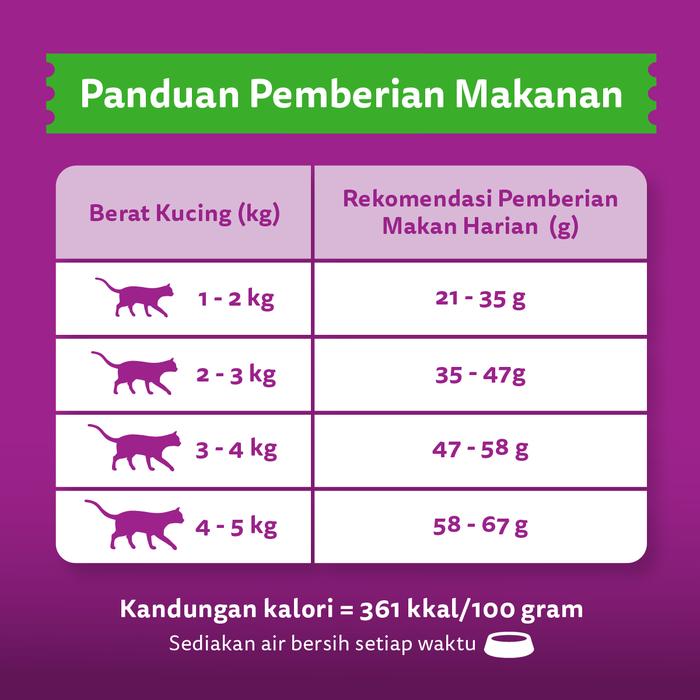 Untuk menjaga kucing Anda tumbuh kuat dan sehat, lihatlah rekomendasi pemberian makanan harian berikut berdasarkan usia dan berat badan mereka.